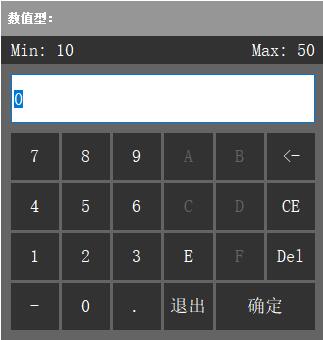 運(yùn)行參數(shù)的設(shè)置在觸摸屏上進(jìn)行,在任意畫面點(diǎn)擊“參數(shù)設(shè)置”進(jìn)入?yún)?shù)設(shè)置畫面(見上圖2),點(diǎn)擊需要設(shè)置的參數(shù)輸入框,在彈出數(shù)字鍵盤如下圖所示;輸入數(shù)值后,點(diǎn)擊“確定”按鈕保存并關(guān)閉輸入窗口,點(diǎn)擊“退出”直接關(guān)閉輸入窗口,且參數(shù)不保存。